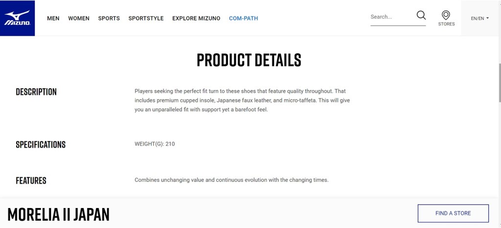 Now, when the white colour and other colourways release in the updated Morelia maybe that will be when Mizuno will do a huge blast about what has been changed. And I personally hope they do, because spoiler alert for my later review, they’re really bloody good. Like, incredibly good. But part of my concern comes from the fact that classic leather boots have a hard time selling online as it is and given that Mizuno relies heavily on online sales through retailers outside of Europe, surely pushing out information out about the new Morelias will only serve to benefit them. Look at the information page on Mizuno Japan’s website versus the EU site.