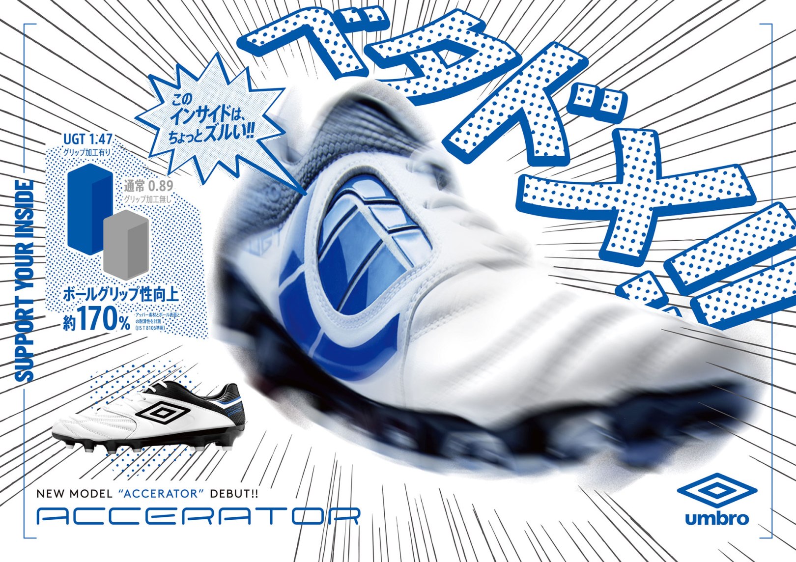 Umbro Japan’s best kept secret has always been the Accerator Pro series. It’s continued popularity in Japan means that the Double Diamond has had a solid foundation to build on here and with the launch of the newest model in the series, this looks set to continue. The motto for this new boot is “Support your inside”.