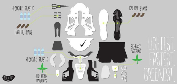 The GreenSpeed was a huge step forward in terms of materials. The boot was made of “from a mix of material including 50% castor beans and 50% plastic where the sock liner is made from 100% castor beans. the laces, tongue and lining of the Nike GS, are formed from a minimum of 70% recycled materials while the collar and toeboard have a material makeup including least 15% recycled matter.”