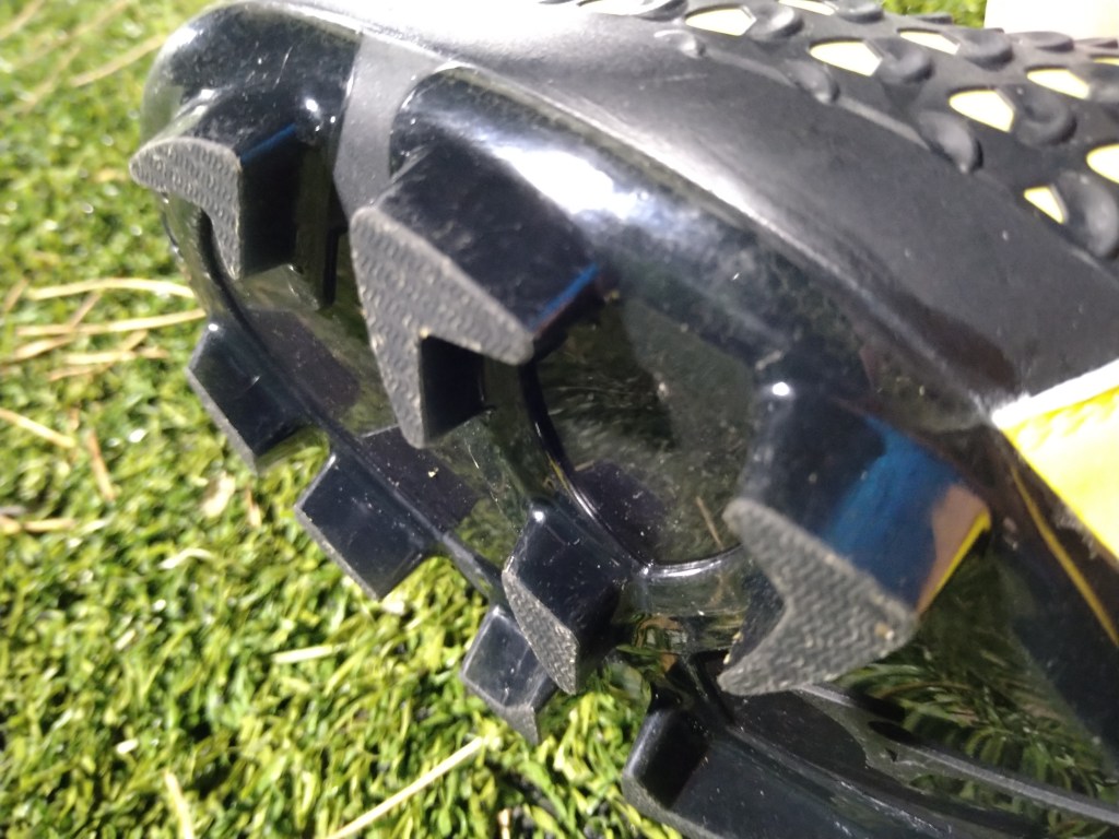 Instead of having four long bladed studs on the heel, there are three and the fourth rear stud is more squared to help keep the foot locked to the ground when hitting the ball.