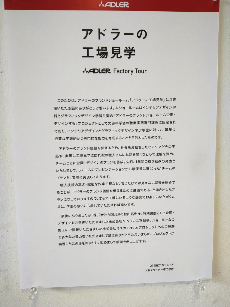 A few weeks ago, I went down to Osaka to see Adler’s exhibition the set up in collaboration with some students at the Osaka Designers’ College. In this collab, Adler asked students to come up with different aspects of Adler and make a presentation displaying their ideas. From this, Adler would choose from five different ideas and decide which of the five projects to choose from. Adler ultimately went with a project that focused on the manufacturing of Adler boots and created a space from there.
